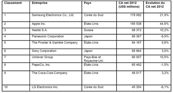 Concernant le classement, l’électronique le domine pour l’année 2012 avec cinq fabricants dont Samsung (21,9%) et Apple (évolution du CA Net de 44.6%) en tête. Nestlé, premier groupe agroalimentaire mondial, est passé à la troisième place en 2012 devant Panasonic. Grâce à sa croissance à deux chiffres, Unilever a été propulsé à la septième place devant PepsiCo.