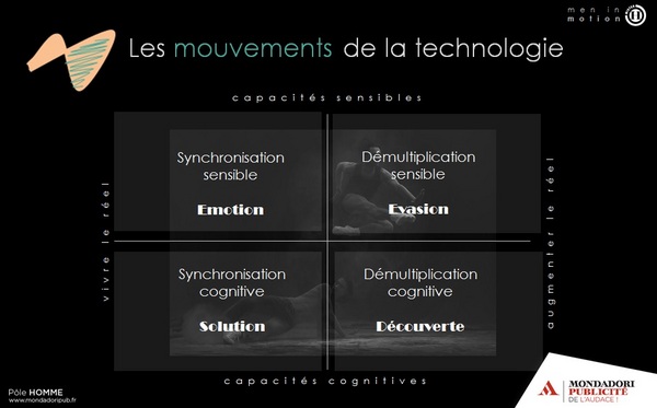 Mondadori Publicité a donc réalisé un mapping qui résume le rapport des hommes à la technologie sur 4 axes : solution, découverte, émotion, évasion, correspondant chacun à ses titres; soit respectivement Auto Plus, Science & Vie, l’Auto-Journal et Sport Auto.