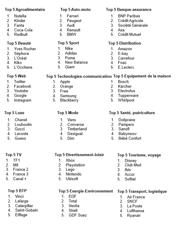 SNCF est en 22ème position alors que l'entreprise ferroviaire communique peu. La marque Ferrari elle-même qui ne fait pas de publicité domine les marques automobiles. Yves Rocher est devant L'Oréal, Louboutin devant Dior, Amazon devant Carrefour.