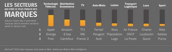 Une idée reçue persiste selon laquelle l'on a tendance à s'exprimer sur une marque lorsqu'on en est mécontent. Bien au contraire, on retrouve en tête des classements sectoriels Nutella, Ferrari, Chanel, Disney… Les marques les plus populaires sont les plus aspirationnelles, celles qui font plaisir ou qui font rêver : marques du web, des technologies en général, de l'automobile, du luxe ou encore du sport sont les plus citées. Les internautes les affichent dans leurs contributions comme signe d'appartenance à leur réseau.