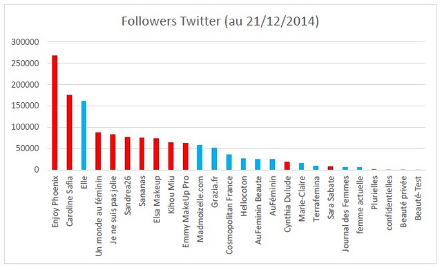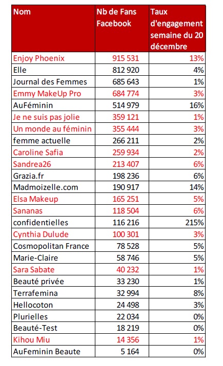 Statistiques Facebook au 21/12/2014. (en rouge les youtubeuses et en noir les sites féminins)
