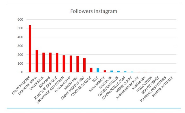 Instagram présente un véritable écart entre les Youtubeuses et les sites féminins : ces derniers n’ayant absolument pas réussi à s’imposer sur Instagram alors que les Youtubeuses montrent un vrai potentiel d’audience et une vraie propension à utiliser ce réseau social. En effet, ce réseau social est souvent plus personnel que Twitter : les photos de produits se confondent au milieu de photos plus privées (amis, famille, vacances) et la relation de confiance y est très forte. Les Youtubeuses ont privilégié ce canal de communication qui permet notamment de mettre en avant plus facilement des photos de produits et de vêtements. Ainsi, elles ont en moyenne 2,3 fois plus de followers sur Instagram que sur Twitter, réseau qui montrait déjà leur fort impact.