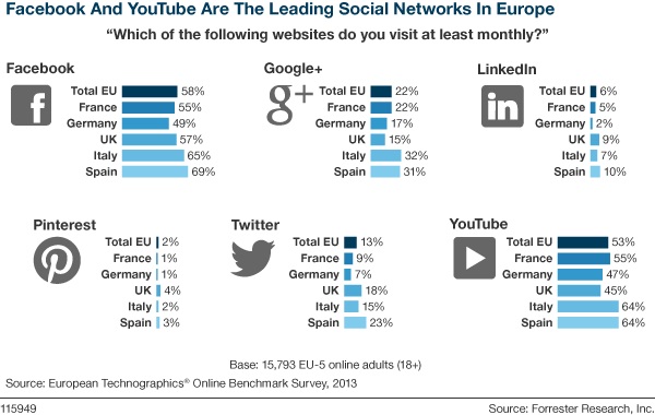 Forrester dévoile une nouvelle infographie quantifiant l’utilisation des réseaux sociaux dans les cinq plus grand pays européens – la France, l’Allemagne, l’Italie, l’Espagne et le Royaume-Uni. Cette infographie est basée sur la dernière étude « European Consumer Technographics », réalisée auprès de plus de 22 000 adultes européens.