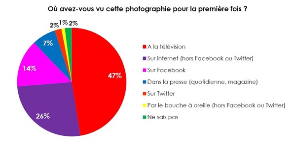 Car ce sont les autres médias qui sont en majeure partie responsable du succès de l’image en France, offrant à Twitter une caisse de résonance de 51 points ! C’est la télévision qui a joué le rôle de média viral en faisant connaître l’image à 47% des répondants, suivi d’Internet (hors Facebook ou Twitter) pour 26% des répondants. Facebook (14%) et la presse écrite (7%) suivent dans le classement.