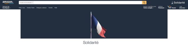 2 | Amazon a dédié sa page d’accueil à la France, en n’affichant aucun produit. A la place, il s’y trouve un drapeau, la Tour Eiffel, ainsi que le mot « Solidarité ».