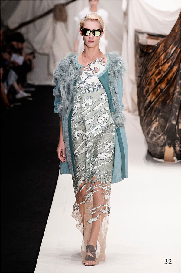 Alena Akhmadullina est une jeune créatrice russe, très réputée à Moscou et qui commence seulement à faire parler d’elle en Europe. Pour sa collection Printemps/ Eté 2016, elle a choisi pour thème la mer et s’est amusée notamment à détourner des estampes du célèbre Hokusai de 1831. Elle a réussi à mélanger harmonieusement poésie japonaise et énergie slave : plusieurs modèles de la collection en soie et mousseline, arborent ainsi La grande vague de Kanagawa qui épouse parfaitement le corps des mannequins. Gageons qu’avec cette dernière collectionAlena Akhmadullina gagnera encore plus en notoriété : la célèbre estampe sur bois de l'artiste japonais Hokusai, extraite du recueil Trente-six vues du mont Fuji (1931) est une référence mondiale ; n’oublions pas qu’elle a sa propre émoticone sur les réseaux.