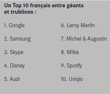 Viennent compléter le top 5, dans l’ordre : Android, Wikipedia, Google, et Dyson, le leader britannique de l’électroménager haut-de-gamme. Trois marques d’Alphabet signent la liste : Android, Google et YouTube (#7). Microsoft (#8), Ikea (#9) et Disney (#10) terminent le top 10.