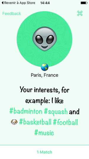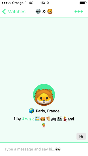Fini les autobrainstorming photos, fini les descriptions enrobées, nous revenons au cœur de la relation avec les centre d’intérêts. Du moins en théorie. L'expérience utilisateur est agréable et fluide mais en quelques minutes, la rédaction a obtenu 4 matchs : 2 avatars lion, 1 avatar smiley la tête à l’envers, et un avatar abeille avec pleins d’emojis hamburger, pizza, flamenco… et sans rien savoir sur le nom ou le genre de la personne. La discussion s’annonce compliquée.