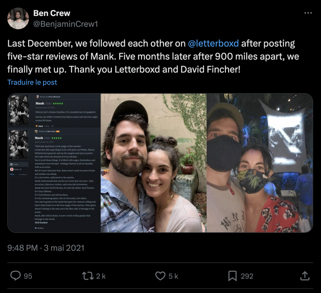 Cette appli de niche n’est pas la seule à connaître un succès fulgurant. Ravelry, réseau social pour les fans de tricot, compte plus de 9 millions d’utilisateurs. Goodreads, communauté de lecteurs, cumule plus de 150 millions de membres. Letterboxd, l’appli préférée des cinéphiles, a vu son nombre d’abonnés passer de 2 à 14 millions entre 2020 et 2024. L’histoire de Ben et Erica, qui se sont rencontrés via l’application grâce à leur amour pour Mank, l’œuvre de David Fincher, a fait le tour d’Internet. Dans son rapport annuel des tendances, Strava indique qu’un membre de la génération Z sur cinq a déjà eu un rendez-vous avec une personne rencontrée en faisant du sport.