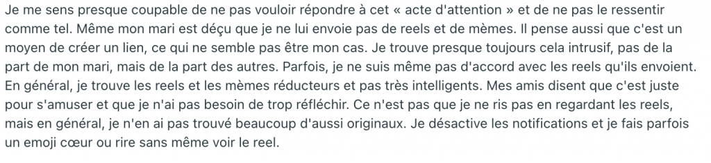 La personne en face acceptera peut-être l’offrande avec un petit émoji cœur ou mort de rire, puis passera à autre chose. Dans certains cas, ces messages restent lettre morte, ce qui peut provoquer la même angoisse que lorsqu’un message est laissé en « vu » sans réponse. D’autres perçoivent ces tentatives de connexion émotionnelle comme une intrusion numérique non sollicitée dans leur vie. Sur Reddit, une femme explique qu’elle se sent coupable de ne pas répondre aux sollicitations de son mari et qu’elle en vient à réagir à un Reel avec un émoji sans même avoir regardé la vidéo.