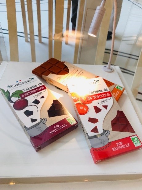 Inspirée de l’authentique tablette de chocolat que tout le monde aime, neuf étudiants (en ingénierie alimentaire et design) ont imaginé cette déclinaison à base de légumes. 100% naturelle, elle est fabriquée grâce à des produits frais non calibrés (#légumesmoches) et participe donc à lutter contre le gaspillage alimentaire. Avec, on peut faire une infinité de recettes : muffins, cookies ou encore des sauces. Il existe pour l’instant 4 parfums différents : tomate, poivron rouge, potiron et betterave. La jeune entreprise nantaise Cocasse est récompensée du prix de l’innovation « espoir » au Salon international de l’alimentation, à Paris.