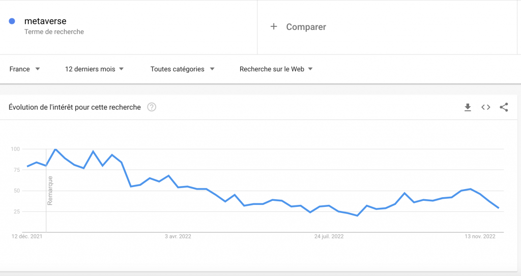 La baisse d’intérêt se constate aussi sur Google Trend. La courbe de la recherche « metaverse » décroît lentement mais sûrement depuis janvier 2022 – date à laquelle le nombre de requêtes pour le mot atteignait son pic.