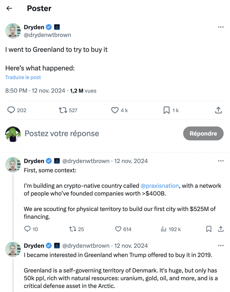 Dryden Brown, PDG de Praxis, une start-up soutenue par le milliardaire Peter Thiel, s'est lui aussi intéressé de près au territoire groenlandais. À 28 ans, ce jeune entrepreneur s'est rendu sur place pour explorer les possibilités d'acquisition d'une partie de l'île, avec l'ambition d'y construire une "crypto-cité-état". Dans son thread où il relate son voyage et explique avoir un projet pour remplacer les 500 millions de dollars de subventions danoises.